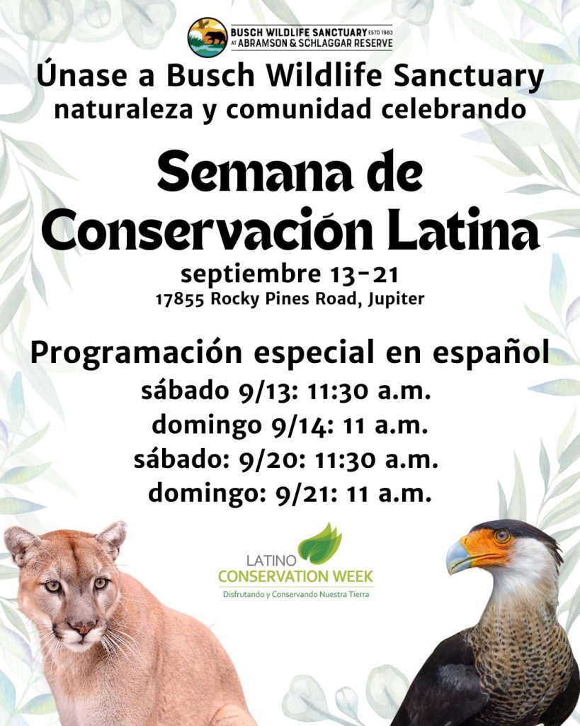 Júpiter, FL – Acompaña al Busch Wildlife Sanctuary en la Reserva Abramson & Schlaggar, una reconocida organización sin fines de lucro dedicada a la conservación de la vida silvestre y la educación ambiental, en la celebración de la Semana de la Conservación Latina con programación especial en español durante días seleccionados del 13 al 21 de septiembre.