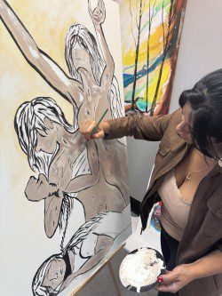 Gabriela Heidemann, activista comunitaria y pintora, por medio de las pinturas muestra el dolor de su experiencia vivida en la exposición «Soy una Sobreviviente», una obra de acrílico sobre lienzo con cadena 3D.